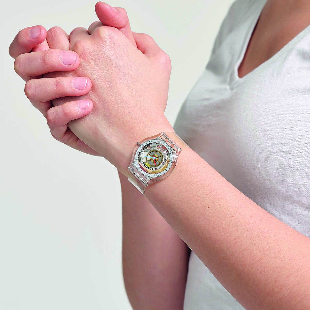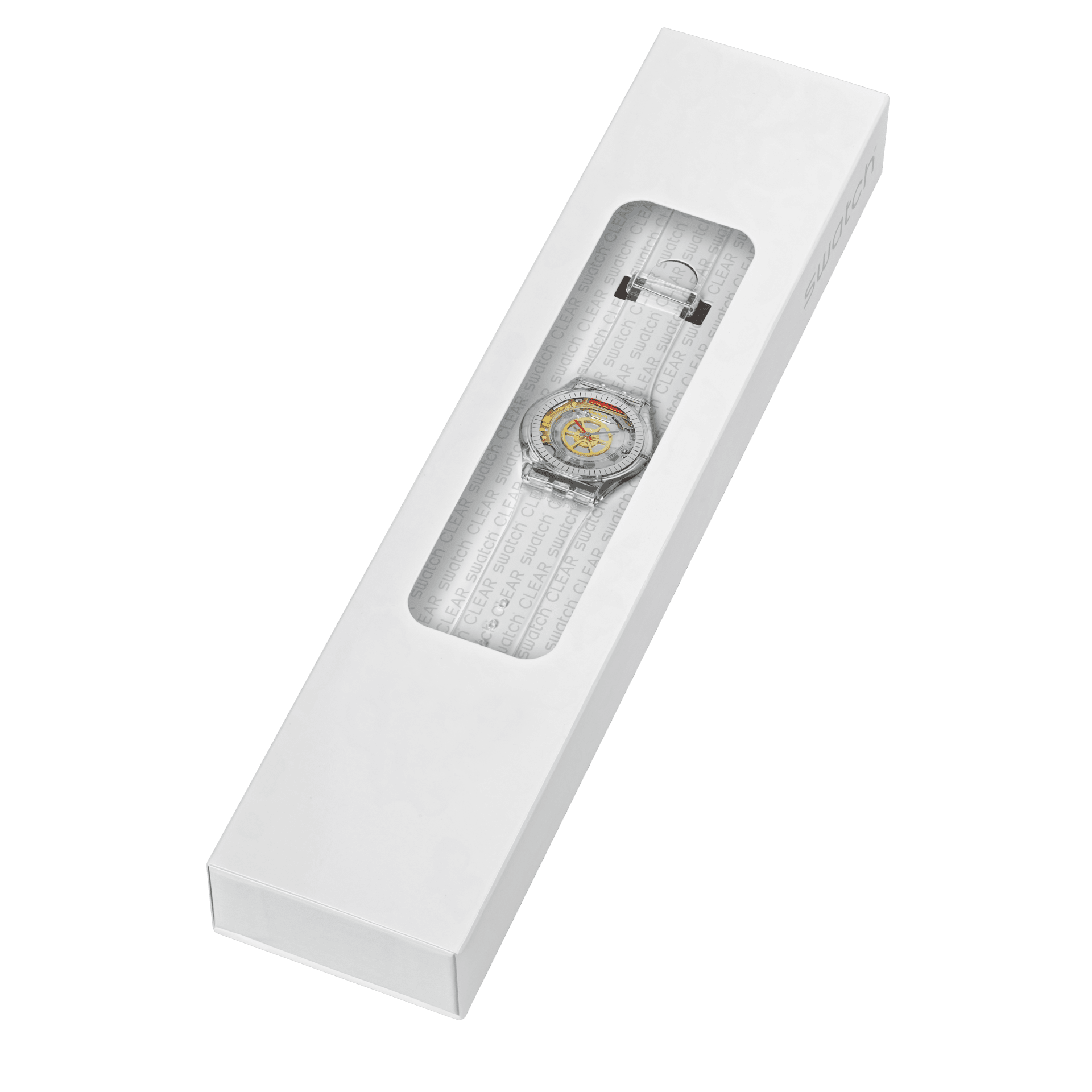 Un orologio ultrasottile trasparente, intimo e che diventa come una seconda pelle, con un cinturino chiaro in TPU e una cassa chiara di origine biologica genera un leggero contrasto con il quadrante trasparente, caratterizzato da un anello argentato e da lancette rosse, blu e gialle.
