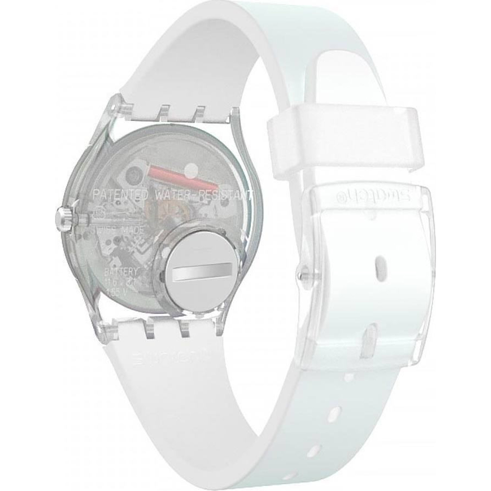Con il celeste di ULTRACIEL (GE713), le nuvole sono solo un ricordo. La chiarissima tonalità di blu del cinturino è perfettamente abbinata al bianco del quadrante, ricoperto da un vetro Swatch Solar Spectrum azzurro.