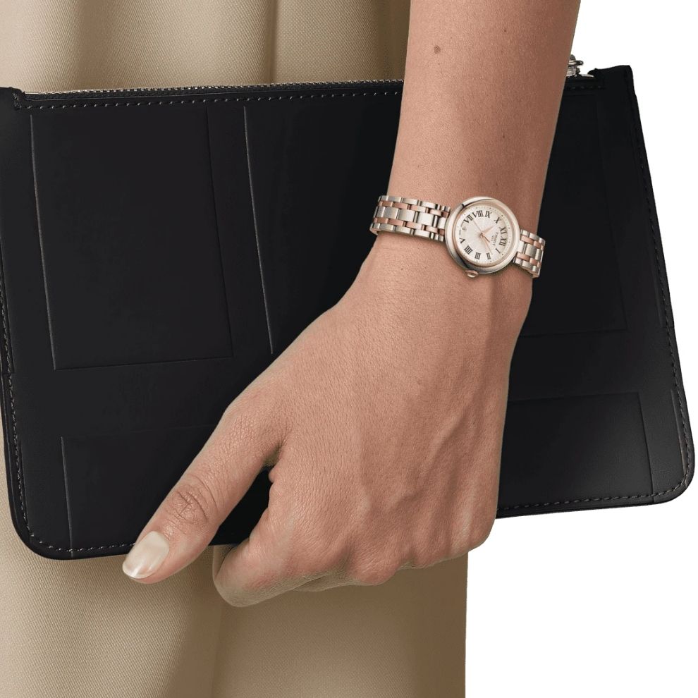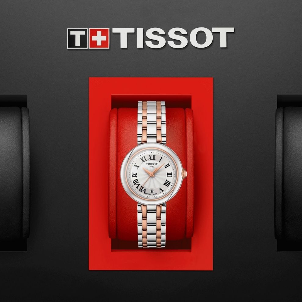 Il Tissot Bellissima Small Lady colpisce per il suo design elegante e per i bellissimi dettagli. Questo modello ha un movimento al quarzo Swiss-Made e un vetro zaffiro antigraffio con numeri romani e datario. La cassa in acciaio inossidabile 316L racchiude il quadrante bianco e il bracciale in acciaio inossidabile 316L con chiusura a farfalla con pulsanti.