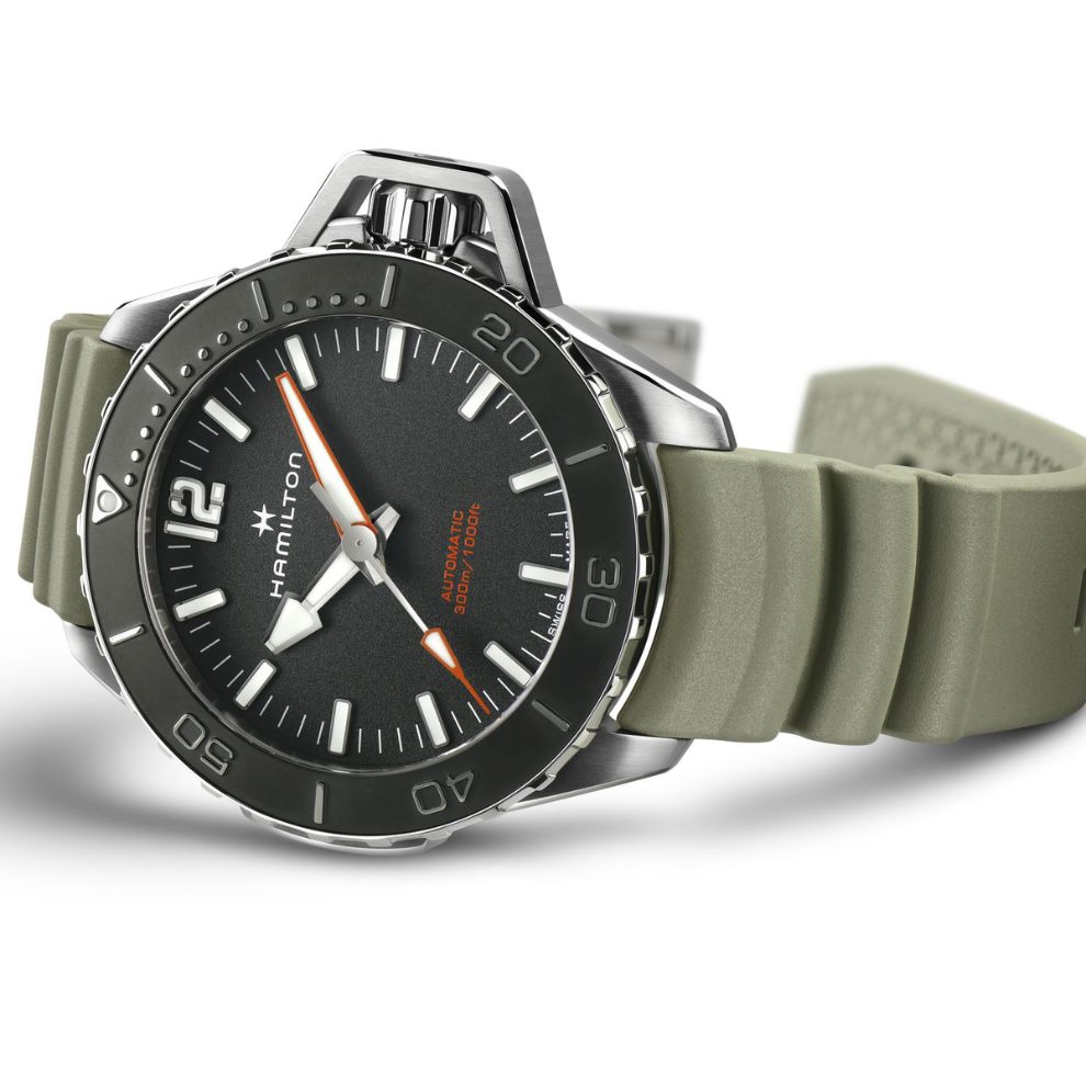 Con un nuovo look audace, il Khaki Navy Frogman Automatic è l’orologio Hamilton tecnicamente migliore per le avventure in mare. Progettato per garantire precisione, leggibilità e resistenza, porta l’insondabile potenza dell’oceano al polso. È inoltre dotato di una protezione della corona dalla forma unica, e di un cinturino in caucciù ondulato.