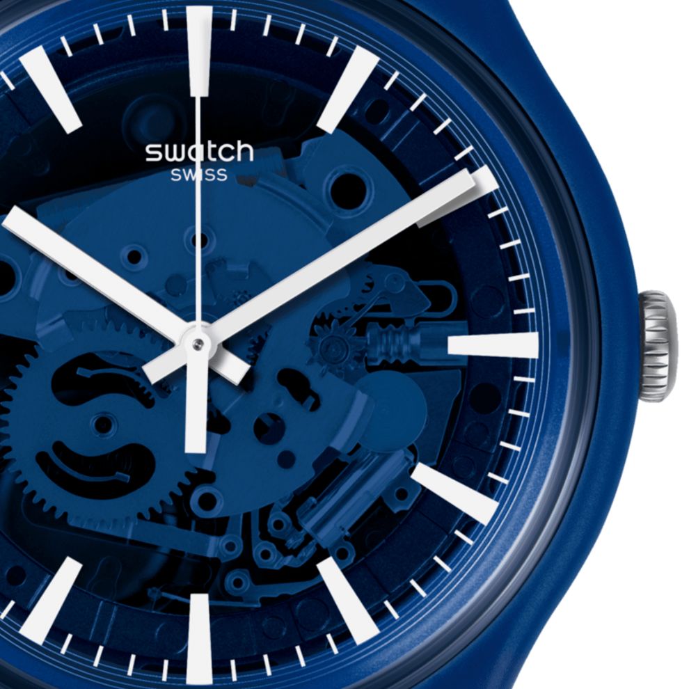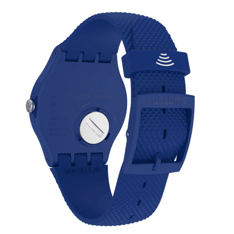 L'intenso blu opaco della cassa in plastica, come anche del cinturino e del passante in silicone, fa da sfondo al quadrante blu trasparente alla moda con stampa bianca di questo New Gent SwatchPAY!.