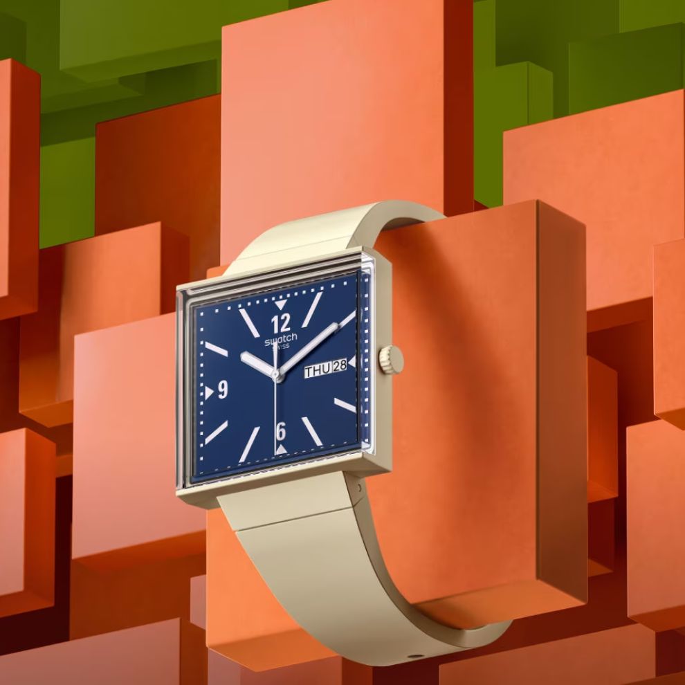 La cassa quadrata dell'orologio BIOCERAMIC è caratterizzata da un vetro biosurced edge-to-edge che permette una visione laterale delle lancette miste dell'orologio. Il quadrante quadrato è dotato di lancette che si illuminano al buio e a ore 3 di una finestra con la data del giorno. Il quadrante è completato da un cinturino integrato in materiale biosurced. Un copribatteria stampato sul retro raffigura uno dei quadranti che hanno ispirato questo orologio quadrato beige con quadrante blu.