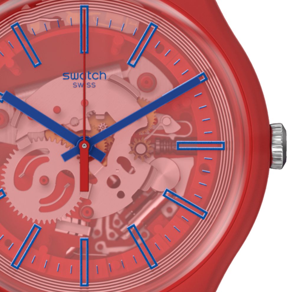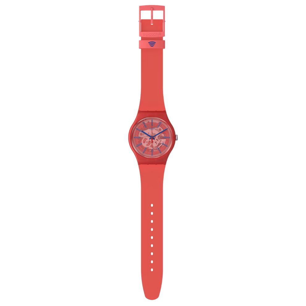 Tipico di questo NEW GENT BIOSOURCED rosso è un quadrante rosso trasparente con una stampa blu, lancette blu e vetro biosourced. Il cinturino e la cassa di questo SwatchPAY! sono in materiale biosourced rosso chiaro opaco, con dettagli rosa e blu che decorano il cinturino.