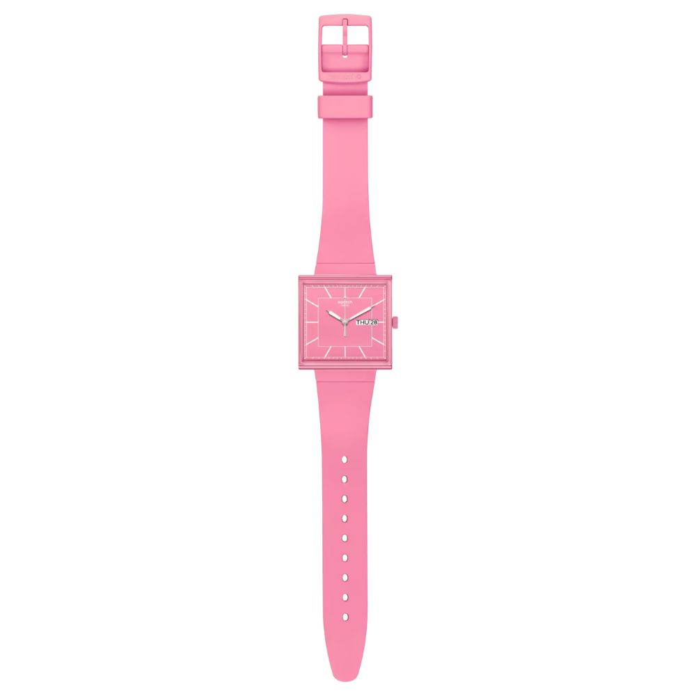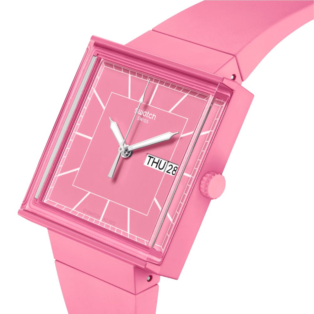 La cassa quadrata di quest’orologio BIOCERAMIC rosa è caratterizzata da un vetro biosourced edge-to-edge che permette una vista laterale degli indici bianchi stampati dell'orologio. Il quadrante quadrato è dotato di lancette argentate fosforescenti e di una finestra per la data a ore 3. Il quadrante è completato da un cinturino biosourced integrato con fibbia BIOCERAMIC. Il coperchio della batteria stampato sul retro raffigura una vista del quadrante dell'orologio.