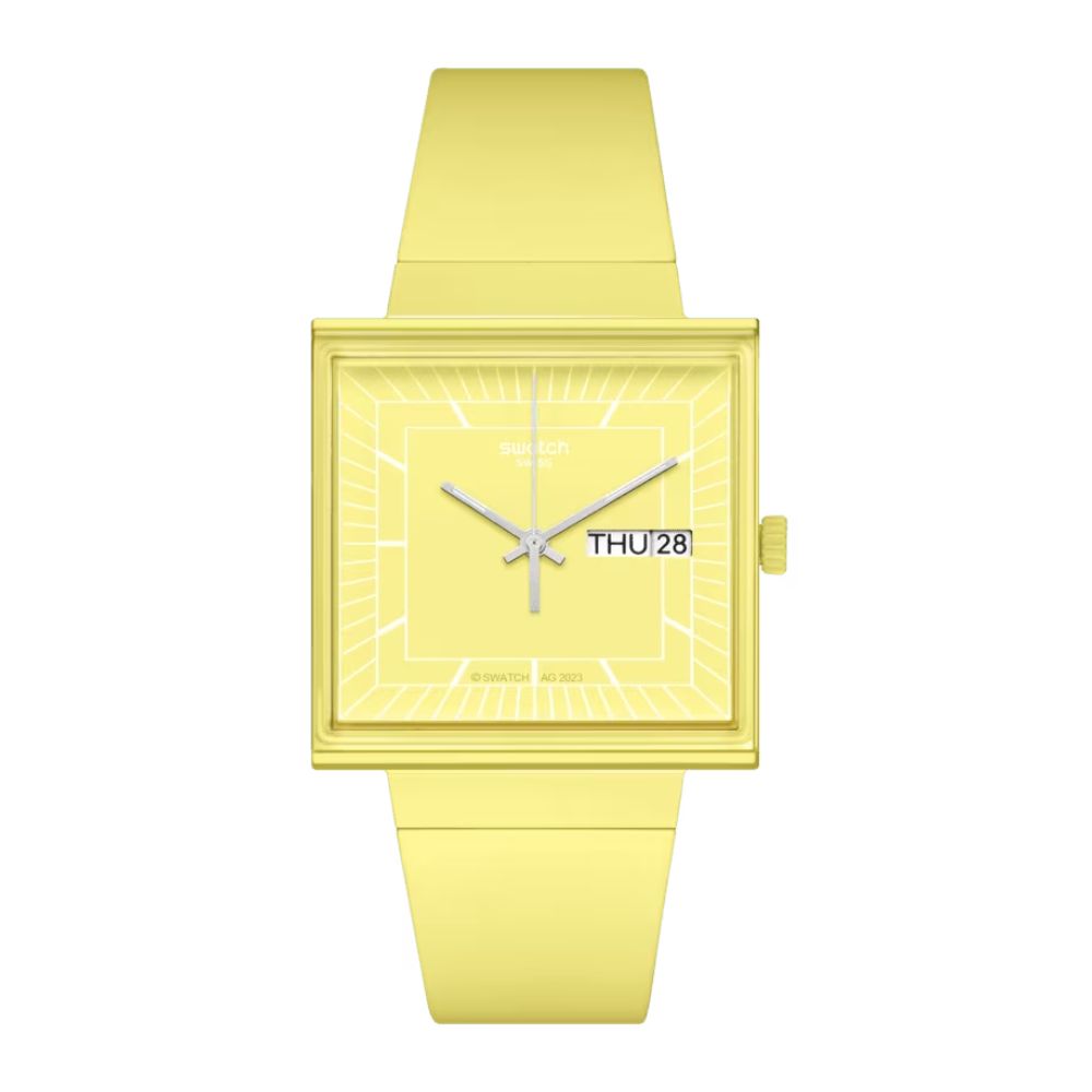 La cassa quadrata di quest’orologio BIOCERAMIC giallo limone è dotata di un vetro biosourced edge-to-edge che permette una vista laterale degli indici bianchi stampati dell'orologio. Il quadrante quadrato è dotato di lancette argentate fosforescenti e di una finestra per la data a ore 3. Il quadrante è completato da un cinturino biosourced integrato con fibbia BIOCERAMIC. Il coperchio della batteria stampato sul retro raffigura una vista del quadrante dell'orologio.