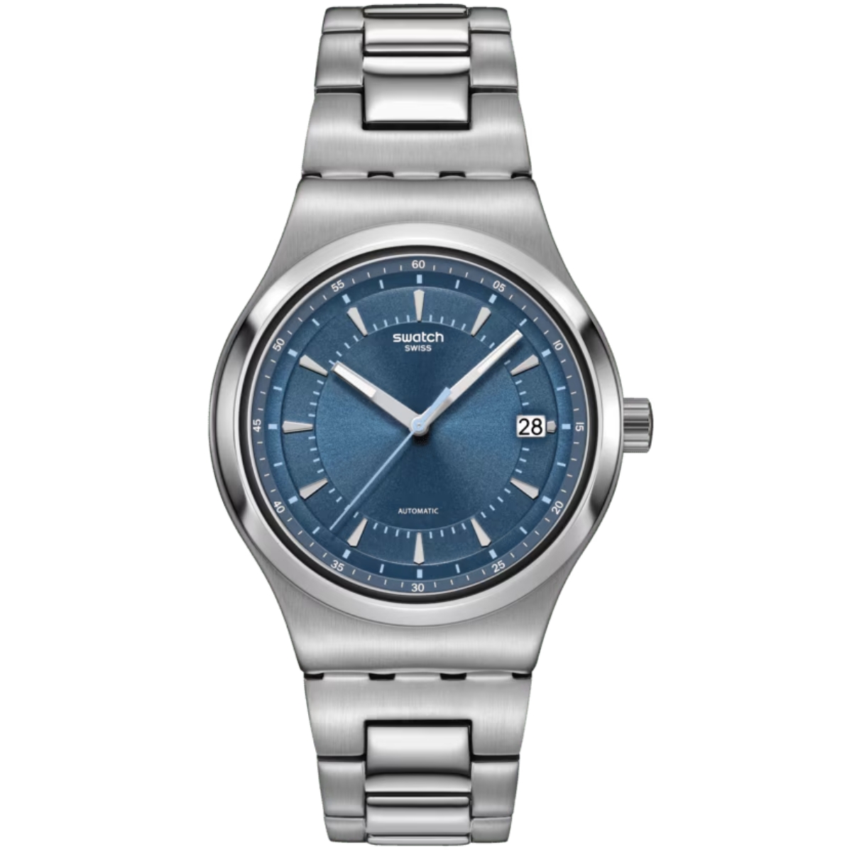 Questo elegante orologio automatico presenta un quadrante blu spazzolato soleil con indici color argento, lancette di ore e minuti che si illuminano al buio, lancetta dei secondi azzurra, anello esterno azzurro con tacche dei minuti stampate in bianco e un datario bianco con stampa nera a ore 3. La cassa in acciaio spazzolato è completata da una lunetta in acciaio inossidabile lucido e lascia intravedere il movimento SISTEM51 con stampa digitale sul fondello. Completano il look il bracciale in acciaio inossidabile con finiture spazzolate e lucide e la fibbia a farfalla.
