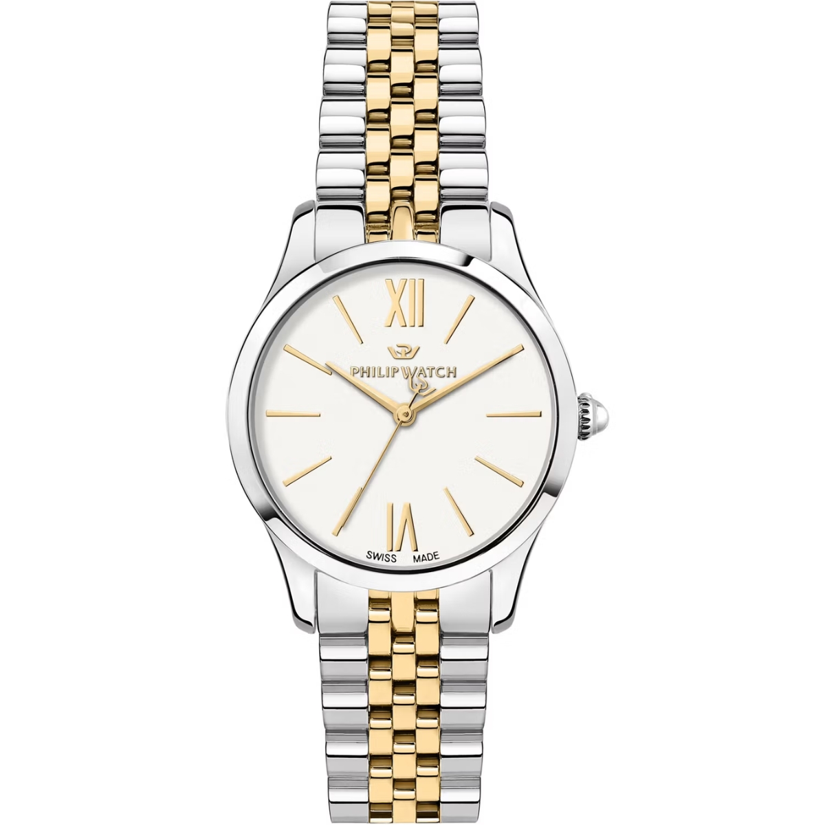 Orologio Philip Watch Grace - R8253208522 - Philip Watch experience: Lady, Genere : Donna, Materiale e finitura cassa: Acciaio, Misura cassa: 32mm, Spessore cassa: 8,75, Finitura cassa: Satinato, Colore cassa: Silver, Gold, Vetro: Vetro zaffiro, Materiale cinturino: metallo, Colore cinturino: Silver, Oro, Chiusura: Fibbia deplojante con pulsanti, Swiss made: Sì, Water resistant: 10 atm, Garanzia: Ufficiale 2 anni Philip Watch, Confezione: Originale Philip Watch