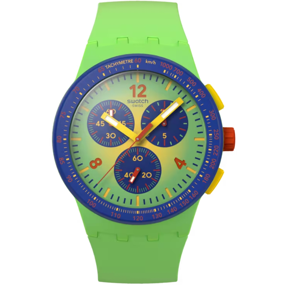 Questo cronografo presenta un quadrante giallo e verde chiaro sfumato con stampa multicolore, lancette delle ore e dei minuti gialle che si illuminano al buio e una lancetta dei secondi rossa. La cassa verde chiaro opaco ha una lunetta blu opaco con scala tachimetrica stampata in rosso e giallo, pulsanti gialli opachi e una corona rossa. Il cinturino verde chiaro e giallo opaco e sfumato, il passante blu opaco e la fibbia blu opaco completano l'orologio.
