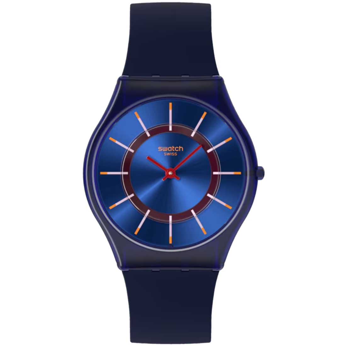 Questo orologio ultrapiatto presenta un quadrante blu scuro spazzolato soleil con un anello interno stampato in rosso scuro, indici viola chiaro e arancione a doppia tonalità e lancette delle ore e dei minuti rosse, il tutto sotto un vetro biosourced. La cassa blu scuro trasparente opaco è abbinata a un cinturino blu scuro e rosso scuro opaco e sfumato, con passante e fibbia rosso scuro trasparente e opaco.