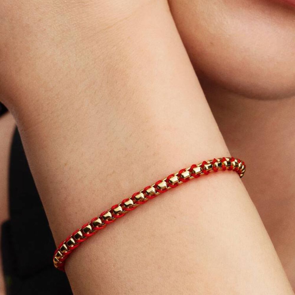 Aggiungi un tocco di colore al tuo look con questo bracciale unico, caratterizzato da un intreccio in tessuto rosso e completato da una delicata chiusura a sfera.