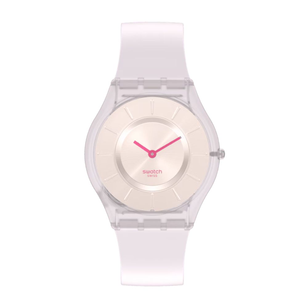 Questo orologio ultra-sottile presenta un quadrante bianco avorio spazzolato soleil con logo Swatch stampato in rosa a contrasto e lancette rosa abbinate a una cassa trasparente biosourced.